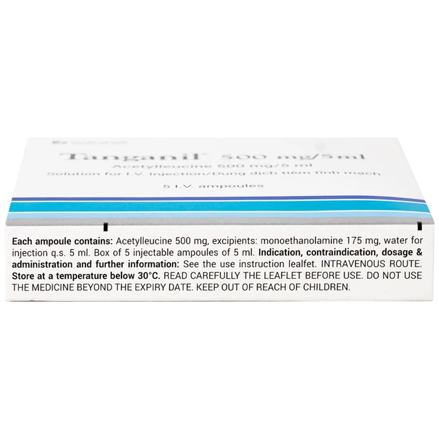 Tanganil 500 được điều chế ở dạng dung dịch tiêm tĩnh mạch, đóng gói theo quy cách: Hộp 5 ống, mỗi ống 5ml.